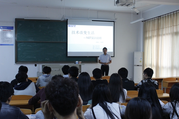 首先,苏老师向大家介绍了NIIT的建立背景和发展情况。NIIT成立于1981年,使命是“把人和计算机成功地结合起来”是一家集软件培训、软件开发和软件外包服务等为一身的综合性企业。针对入职前大学生专业动手能力较差、专业实践机会较少的情况,NIIT为职场新人提供了“教育咨询—IT培训—推荐就业”一站化服务。在各企业招聘员工之前对同学进行岗前培训,通过培训合格后,能够熟悉企业流程,熟练进行项目开发。随后,苏老师以软件开发工作为例,对当前就业情况进行了分析。最后,苏老师向同学们介绍了NIIT人才培养计划——源于实践的项目。其独特的教学体系、学习模式可用“授课培训”和“CBT网上学习”来概括,学员在中心的学习即是在真实的工作环境中成长。