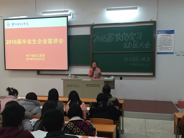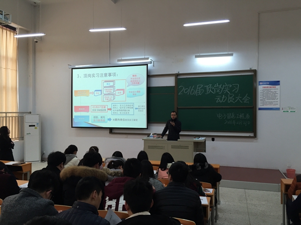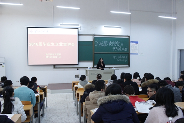 2016年2月21日上午电子信息工程系2013级学生和相关教师D302召开2016届毕业生顶岗实习动员大会。会议由范灵芝书记主持。