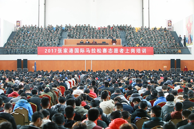 11月23日中午,2017张家港国际马拉松赛志愿者培训在我院体育馆举行。3200名安保志愿者云集我院,接受市宣传部文明办组织的上岗培训。培训主要包括志愿服务通识培训、安全保卫工作培训和交通秩序维护培训三项内容。苏州市公安局专家为志愿者培训指导并讲述注意事项,全体志愿者去到各自的志愿服务点位进行实战演练。