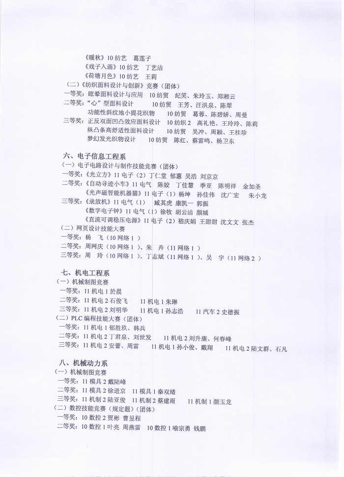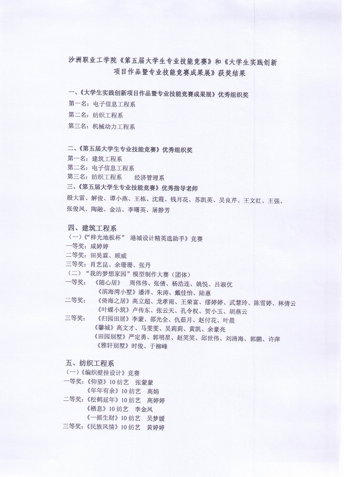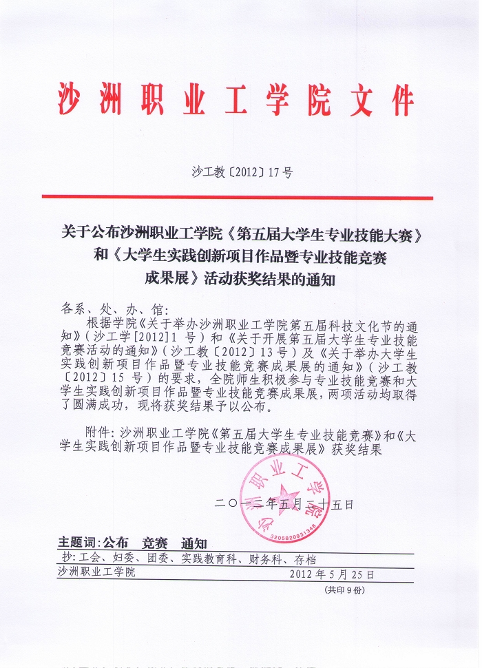 沙工教〔2012〕17号关于公布沙洲职业工学院《第五届大学生专业技能大赛》和《大学生实践创新项目作品暨专业技能竞赛成果展》活动获奖结果的通知